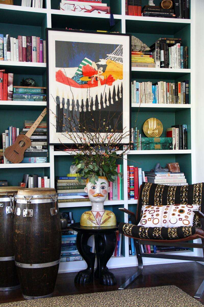 “For every stack of books I add to a shelf,” Flynn says, “I like to have at least two interesting objects to offset the linearity.”