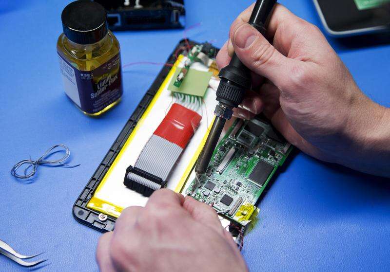 Tool kits include screwdrivers, pliers, scissors, tweezers and wrenches. The specialists don't hit an "on" switch until the equipment is placed inside a sealed box, to prevent Wi-Fi signals from reaching or being sent from the devices. A technician with a buzz cut and magnifying glasses leans over a digital tablet's colorful circuit board, soldering small wires that could eventually allow him to peek into the user's emails, documents and web-browsing habits.