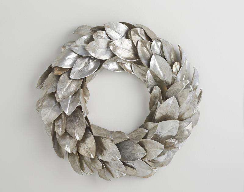 Crate & Barrel has a pretty wreath made of silver-painted magnolia leaves that would work in both traditional and contemporary homes. Another is made of rolled paper and twigs to create a swirl of texture that taps the rustic trend. (www.crateandbarrel.com)