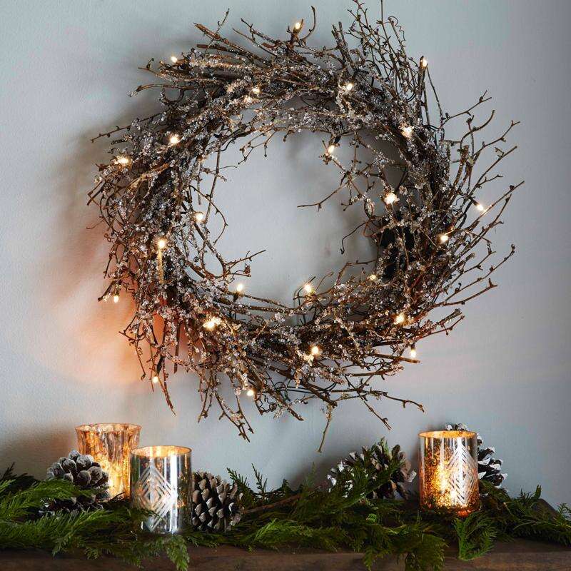 Battery-operated, miniature LED fairy lights can be threaded through a wire wreath frame to be hung anywhere or put on a mantle. Look for warm white lights on silvery or copper wire, or go with all crimson or midnight blue. (www.save-on-crafts.com)