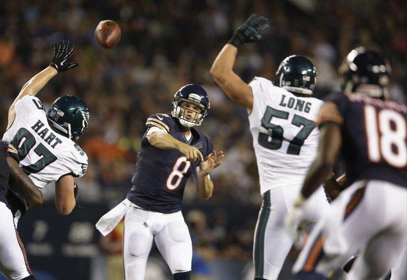 Bears quarterback Jimmy Clausen (8) throws a touchdown pass to wide receiver Micheal Spurlock (18) during the second half of an NFL preseason football game against the Philadelphia Eagles on Friday, Aug. 8, 2014, in Chicago. Associated Press