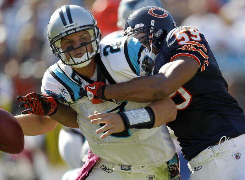 Carolina Panthers quarterback Jimmy Clausen (2) is sacked by Chicago Bears linebacker Pisa Tinoisamoa (59) in the second half of the Bears' 23-6 win in an NFL football game in Charlotte, N.C., Sunday, Oct. 10, 2010. Associated Press