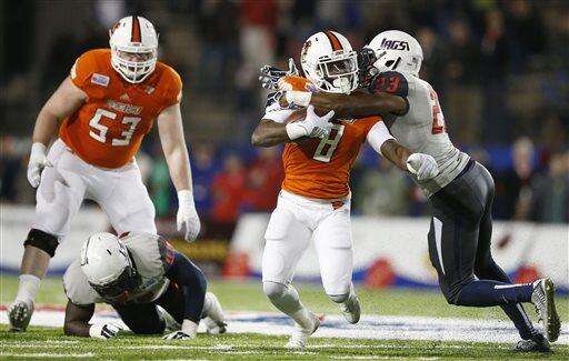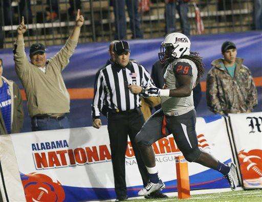 The Jaguars, playing in their first bowl game after starting the program in 2009, had moved 73 yards in just under 3 minutes to momentarily take the lead. Brandon Bridge hit Danny Woodson Jr. for a 44-yard strike. Terrance Timmons had a 3-yard touchdown run after converting two third-down plays with runs.