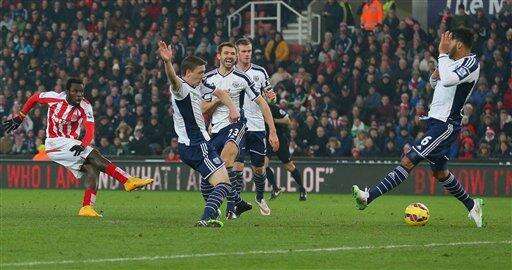 Stoke City's Mame Biram Diouf, left, scores the first goal of the game during their English Premier League soccer match against West Bromwich Albion at the Britannia Stadium, Stoke-on-Trent, England, Sunday, Dec. 28, 2014. (AP Photo/Dave Thompson, PA Wire) UNITED KINGDOM - NO SALES - NO ARCHIVES The Associated Press
