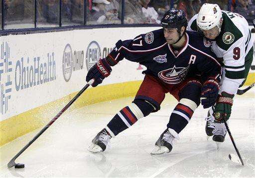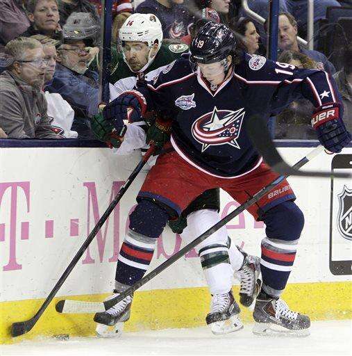 Columbus Blue Jackets' Brandon Dubinsky, left, carries the puck as Minnesota Wild's Mikko Kolvu, of Finland, defends during the second period of an NHL hockey game Wednesday, Dec. 31, 2014, in Columbus, Ohio. (AP Photo/Jay LaPrete) The Associated Press