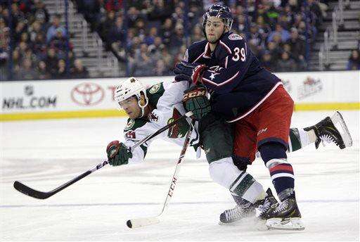 Columbus Blue Jackets' Michael Chaput, right, checks Minnesota Wild's Jason Pominville during the first period of an NHL hockey game Wednesday, Dec. 31, 2014, in Columbus, Ohio. (AP Photo/Jay LaPrete) The Associated Press