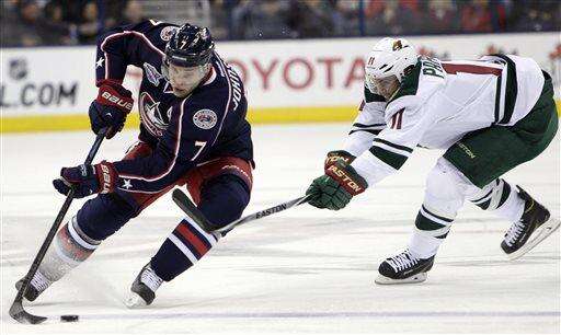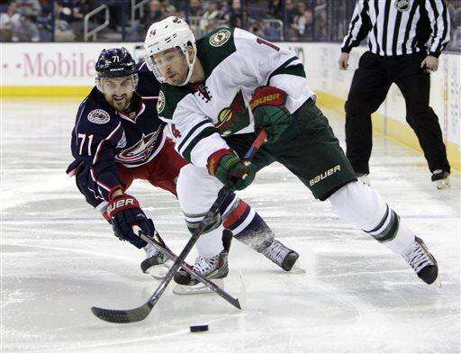 Minnesota Wild's Justin Fontaine, right, carries the puck up ice as Columbus Blue Jackets' Nick Foligno defends during the third period of an NHL hockey game Wednesday, Dec. 31, 2014, in Columbus, Ohio. The Blue Jackets won 3-1. (AP Photo/Jay LaPrete) The Associated Press