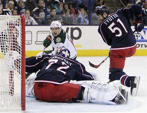 Minnesota Wild's Zach Parise, left, scores against Columbus Blue Jackets' Sergei Bobrovsky (72) of Russia, as Fedor Tyutin, of Russia, defends, during the first period of an NHL hockey game Wednesday, Dec. 31, 2014, in Columbus, Ohio. (AP Photo/Jay LaPrete) The Associated Press