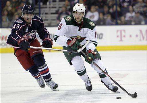 Columbus Blue Jackets' Scott Hartnell, left, chases Minnesota Wild's Marco Scandella up the ice during the third period of an NHL hockey game Wednesday, Dec. 31, 2014, in Columbus, Ohio. The Blue Jackets won 3-1. (AP Photo/Jay LaPrete) The Associated Press
