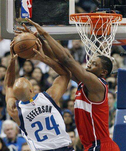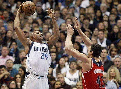 Dallas Mavericks forward Richard Jefferson (24) attempts a shot as Washington Wizards forward Kevin Seraphin defends during the first half of an NBA basketball game, Tuesday, Dec. 30, 2014, in Dallas. (AP Photo/Brandon Wade)
