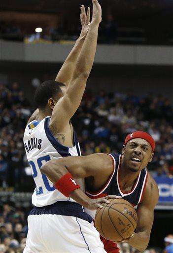 Washington Wizards forward Paul Pierce, right, battles Dallas Mavericks guard Devin Harris (20) for space during the first half of an NBA basketball game, Tuesday, Dec. 30, 2014, in Dallas. (AP Photo/Brandon Wade)