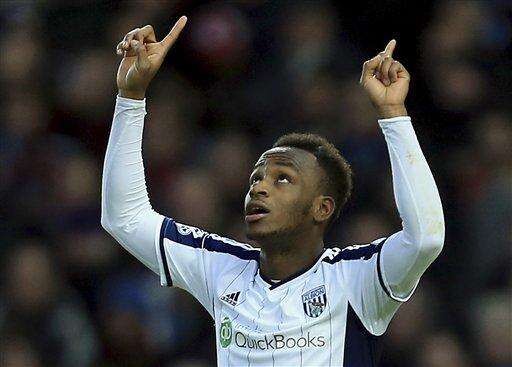 West Bromwich Albion's Saido Berahino, left, celebrates his goal against West Ham during the English Premier League soccer match at Upton Park, London, Thursday Jan. 1, 2015. (AP Photo/PA, Stephen Pond) UNITED KINGDOM OUT NO SALES NO ARCHIVE The Associated Press