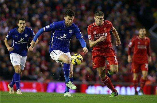 Leicester City's David Nugent, left, and Liverpool's Steven Gerrard battle for the ball during the English Premier League soccer match at Anfield, Liverpool, England, Thursday Jan. 1, 2015. (AP Photo/PA, Peter Byrne) UNITED KINGDOM OUT NO SALES NO ARCHIVE The Associated Press