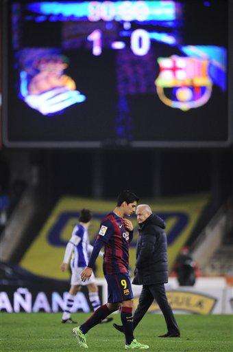 Both of Barcelona's main sports dailies splashed photos of Lionel Messi, Neymar, Dani Alves and Gerard Pique watching from the bench as Barcelona fell behind early in a 1-0 loss at Real Sociedad on Sunday.