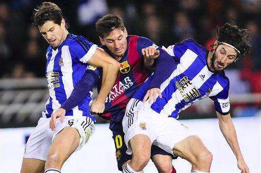 Barcelona's Lionel Messi of Argentina, second left, vies for the ball between Real Rociedad's Inigo Martinez, left, and Esteban Granero, during their La Liga soccer match against Real Sociedad, at Anoeta stadium in San Sebastian, northern Spain, Sunday, Jan. 4, 2015. Barcelona lost the match 1-0.(AP Photo/Alvaro Barrientos) The Associated Press