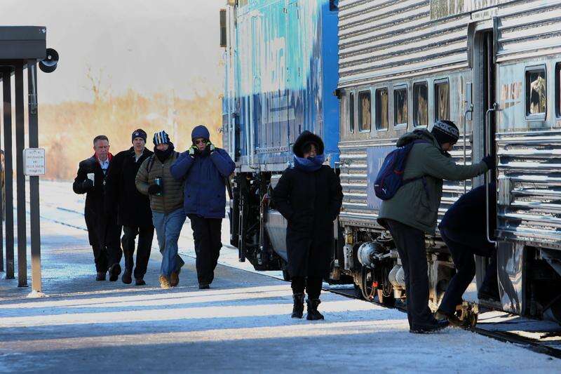 Metra riders bundle up against the cold and stay warm under heat lamps Wednesday morning at the Crystal Lake station.