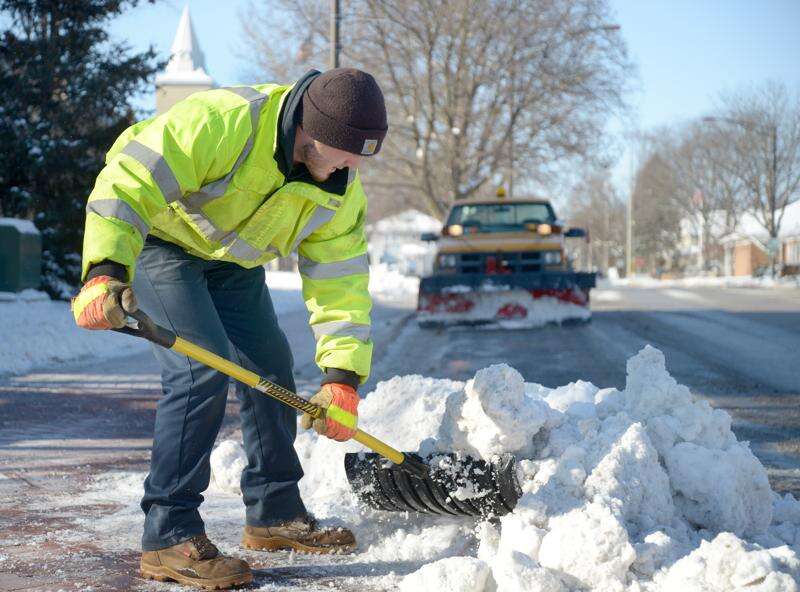 Jason Birschbach with the Batavia Department of Public Works clears snow from the sidewalk in Batavia Wednesday morning. He didn't think he'd be out so much in the cold weather, not bringing his Carhart pants, but said "If you're working, you stay warm."