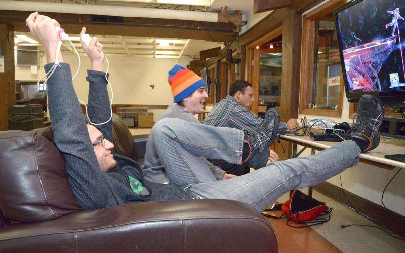 Andrei Patano, 19, of St. Charles East High School celebrates his victory over STC Underground program supervisor Dan Procaccio after playing Super Smash Brothers at the Baker Community Center in St. Charles Wednesday afternoon. The teen rec center opened up four hours early to accommodate students who didn't have school. Darrell Gregg, 14, far right, is a student at Thompson Middle School in St. Charles. "Mom said clean or come here," he said with a laugh.