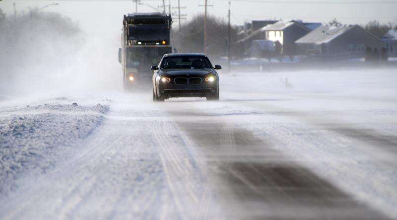 Blowing snow creates hazardous driving conditons along Midlothian Road near Mundelein Wednesday morning.