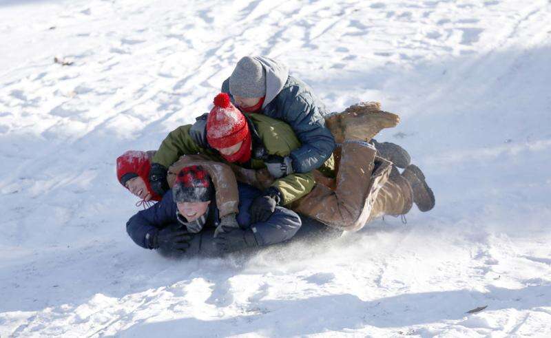 Making a sledding run Wednesday at Wing Park in Elgin are Jason Bartels, 19, left, Jacob Bartels, 18, on bottom, Efren Ramos, 18, center, and Alan Ledezma, 18, on top, as sub-zero temperatures blanket the Fox Valley area Wednesday. The men, all from Elgin, attend Providence Baptist College.