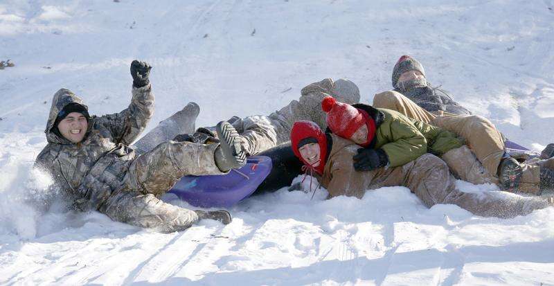 Braving the sub-zero temperatures to get some sledding in at Wing Park in Elgin are Providence Baptist College students, from left, Daniel Barajas, 18, Jason Bartels, 19, Efren Ramos, 18, and Jacob Bartels, 18. Also pictured but not seen and most likely buried under one of their friends are Alan Ledezma, 18, and Joe Helterbran. All the men are from Elgin.