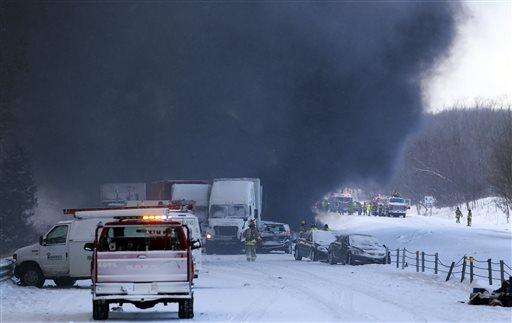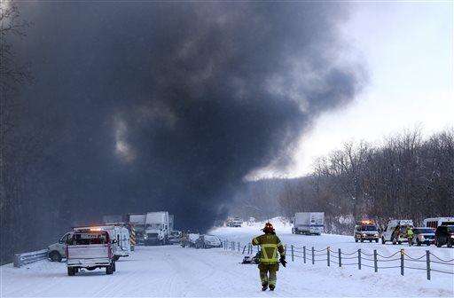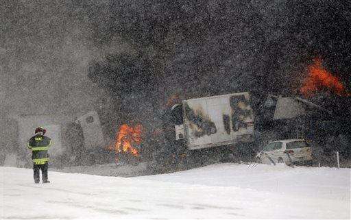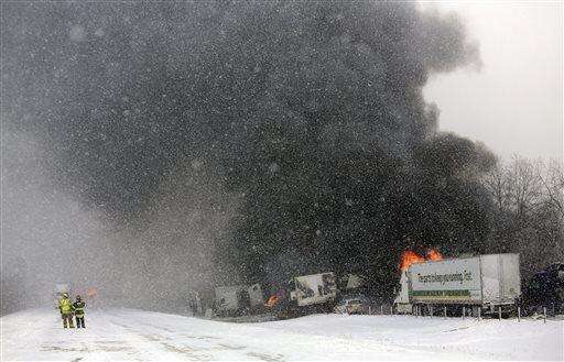 CORRECTS ROAD TO INTERSTATE 94, NOT INTERSTATE 90 - Emergency personnel work at the scene of a fiery crash that closed both sides of Interstate 94, Friday, Jan. 9, 2015, between mile markers 88 and 92 in eastern Kalamazoo County, near Galesburg, Mich. State police say at least one person has died in the series of crashes involving roughly 150 vehicles, including at least two semi-trucks carrying fireworks and other hazardous materials. Authorities are blaming snow, wind and poor visibility in the crash. (AP Photo/Kalamazoo Gazette-MLive Media Group, Mark Bugnaski) ALL LOCAL TELEVISION OUT; LOCAL TELEVISION INTERNET OUT