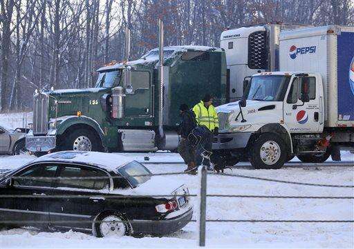GALESBURG, Mich. (AP) - More than 100 vehicles were involved in pileups on a snowy Michigan interstate on Friday, killing a trucker and igniting a fire and explosion on a semi carrying fireworks, police said.