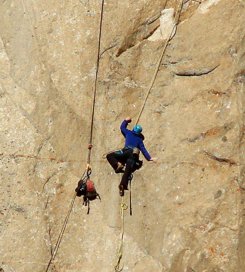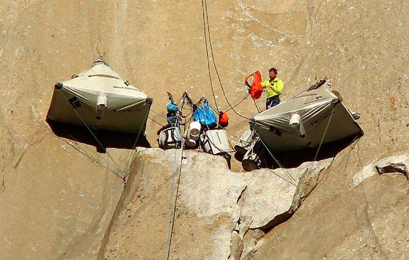 Tommy Caldwell, 36, of Estes Park, Colo., with Kevin Jorgeson, 30, of Santa Rosa, Calif., not seen, set up camp. Associated Press/ Dec. 28, 2014