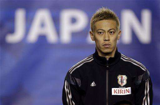 In this March 5, 2014 photo, Japan's Keisuke Honda poses on the pitch before the Kirin Challenge Cup international friendly soccer match against New Zealand in Tokyo. Defending champion Japan, led by AC Milan midfielder Honda, plays newcomer Palestine at Newcastle in its opening match at the Asian Cup on Monday, Jan. 12, 2015 while Jordan takes on 2007 winners Iraq at Brisbane. (AP Photo/Shuji Kajiyama) The Associated Press