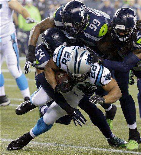 Carolina Panthers running back Jonathan Stewart (28) is tackled by Seattle Seahawks middle linebacker Bobby Wagner (54), defensive tackle Tony McDaniel (99) and cornerback Richard Sherman (25) during the first half of an NFL divisional playoff football game in Seattle, Saturday, Jan. 10, 2015. (AP Photo/Ted S. Warren) The Associated Press