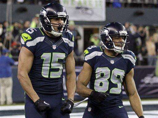 Seattle Seahawks wide receiver Jermaine Kearse (15) celebrates after scoring on a 63-yard touchdown reception next to wide receiver Doug Baldwin (89) during the first half of an NFL divisional playoff football game against the Carolina Panthers in Seattle, Saturday, Jan. 10, 2015. (AP Photo/John Froschauer) The Associated Press