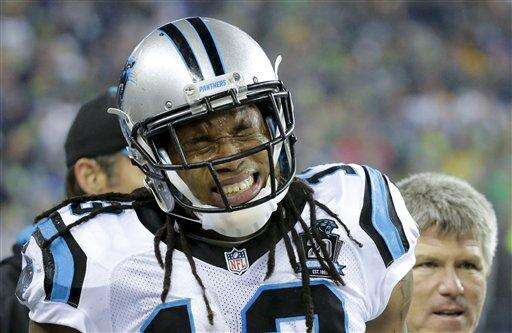 Carolina Panthers wide receiver Kelvin Benjamin is helped to the sideline after being injured against the Seattle Seahawks during the second half of an NFL divisional playoff football game in Seattle, Saturday, Jan. 10, 2015. (AP Photo/Ted S. Warren) The Associated Press