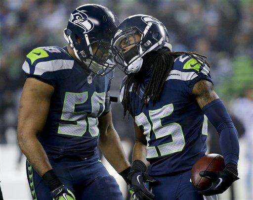 Seattle Seahawks cornerback Richard Sherman, right, celebrates after intercepting a pass by Carolina Panthers quarterback Cam Newton with outside linebacker K.J. Wright (50) during the first half of an NFL divisional playoff football game in Seattle, Saturday, Jan. 10, 2015. (AP Photo/Elaine Thompson) The Associated Press
