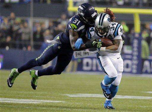 Carolina Panthers running back DeAngelo Williams (34) runs as Seattle Seahawks strong safety Kam Chancellor (31) dives to tackle him during the first half of an NFL divisional playoff football game in Seattle, Saturday, Jan. 10, 2015. (AP Photo/Ted S. Warren) The Associated Press