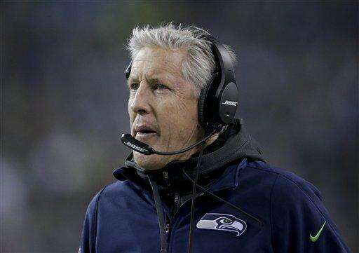 Seattle Seahawks head coach Pete Carroll watches during the first half of an NFL divisional playoff football game against the Carolina Panthers in Seattle, Saturday, Jan. 10, 2015. (AP Photo/John Froschauer) The Associated Press