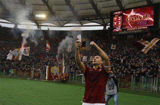 Francesco Totti scored both Roma's goals in the second period. Roma's talismanic captain celebrated his second in unusual fashion by taking a selfie of himself on the pitch.