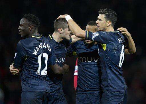 Southampton's Jose Fonte, right, celebrates with teammates after their 1-0 win at Manchester United during the English Premier League soccer match between Manchester United and Southampton at Old Trafford Stadium, Manchester, England, Sunday Jan. 11, 2015. (AP Photo/Jon Super) The Associated Press