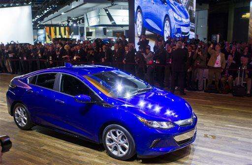 The 2016 Chevrolet Volt hybrid drives on stage at a presentation during the North American International Auto Show, Monday, Jan. 12, 2015, in Detroit. (AP Photo/Tony Ding) The Associated Press