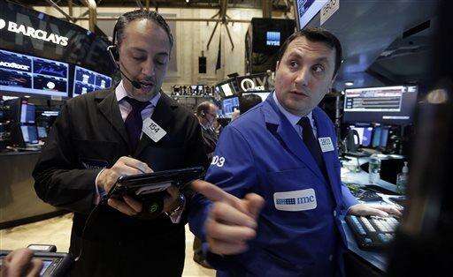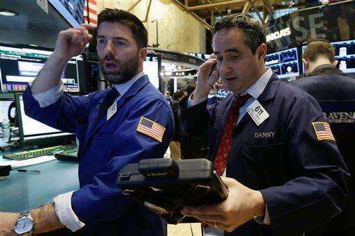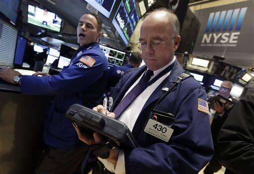 Specialist Thomas McArdle, left, and trader Daniel Trimble work on the floor of the New York Stock Exchange, Wednesday, Jan. 14, 2015, in New York. Stocks are falling and bond prices are rising following some discouraging news on the U.S. economy and a weaker forecast of global growth. (AP Photo/Richard Drew) The Associated Press