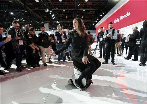 FILE - In this Jan. 13, 2015 file photo, a Honda product specialist demonstrates the Uni-Cub personal mobility device during media previews for the North American International Auto Show in Detroit. (AP Photo/Paul Sancya, File) The Associated Press