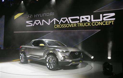 FILE - In this Jan. 12, 2015 file photo, the Hyundai Santa Cruz crossover truck concept is unveiled during the North American International Auto Show, in Detroit. The Santa Cruz concept is a five-seat crossover with a small pickup bed in the back. If people like it, Hyundai could put it on the road in three years. (AP Photo/Carlos Osorio, File) The Associated Press