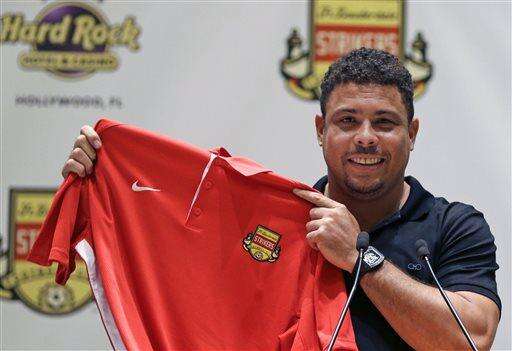 Three-time FIFA player of the year Ronaldo Luís Nazario de Lima, right, poses for photographers with a Fort Lauderdale Strikers jersey with Strikers mascot Hot Shot after a news conference Wednesday, Jan. 14, 2015, in Hollywood, Fla. Ronaldo talked about his new role as part owner of the Fort Lauderdale Strikers. (AP Photo/Alan Diaz) The Associated Press