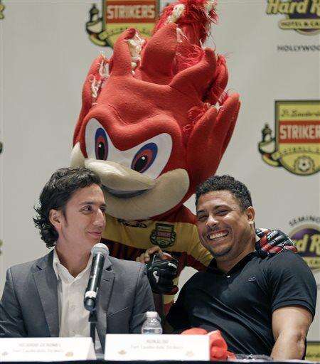 Three-time FIFA player of the year Ronaldo Luís Nazario de Lima, right, laughs as Fort Lauderdale Strikers mascot Hot Shot greets Ronaldo as Strikers co-owner Ricardo Geromel, left, looks on before a news conference Wednesday, Jan. 14, 2015, in Hollywood, Fla. Ronaldo talked about his new role as part owner of the Fort Lauderdale Strikers. (AP Photo/Alan Diaz) The Associated Press
