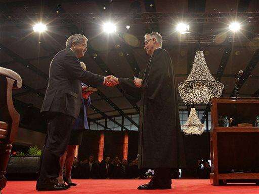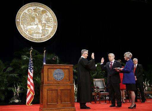 Iowa Supreme Court Chief Justice Mark Cady, left, administers the oath of office to Iowa Gov. Terry Branstad as his wife Chris, right, looks on during inauguration ceremonies, Friday, Jan. 16, 2015, in Des Moines, Iowa. (AP Photo/Charlie Neibergall)