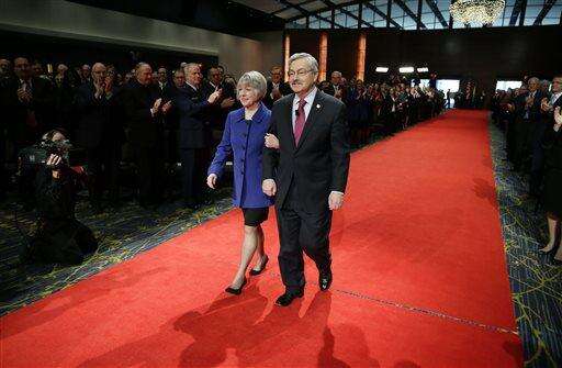 Iowa Gov. Terry Branstad escorts his wife Chris, left, to the stage during inauguration ceremonies, Friday, Jan. 16, 2015, in Des Moines, Iowa. (AP Photo/Charlie Neibergall)