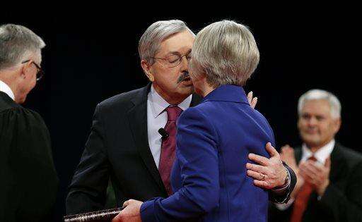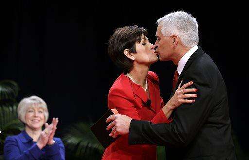 Iowa Gov. Terry Branstad kisses his wife Chris, right, after taking the oath of office during inauguration ceremonies, Friday, Jan. 16, 2015, in Des Moines, Iowa. (AP Photo/Charlie Neibergall)