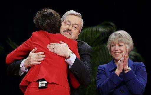 Iowa Gov. Terry Branstad, left, gets a hug from Iowa Lt. Gov. Kim Reynolds after taking the oath of office during inauguration ceremonies, Friday, Jan. 16, 2015, in Des Moines, Iowa. (AP Photo/Charlie Neibergall)
