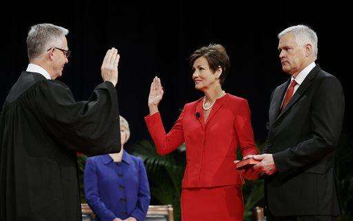 Iowa Supreme Court Chief Justice Mark Cady, left, administers the oath of office to Iowa Lt. Gov. Kim Reynolds as her husband Kevin, right, looks on during inauguration ceremonies, Friday, Jan. 16, 2015, in Des Moines, Iowa. (AP Photo/Charlie Neibergall)