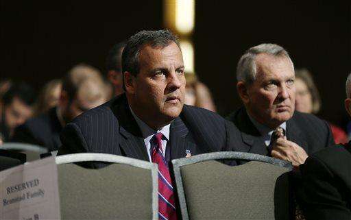 New Jersey Gov. Chris Christie, left, greets U.S. Sen. Joni Ernst, R-Iowa, and U.S. Sen. Charles Grassley, R-Iowa, right, during Iowa Gov. Terry Branstad's inauguration ceremonies, Friday, Jan. 16, 2015, in Des Moines, Iowa. (AP Photo/Charlie Neibergall)