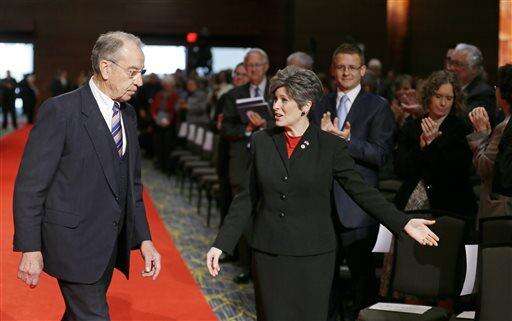 U.S. Sen. Charles Grassley, R-Iowa, left, is escorted to this seat by U.S. Sen. Joni Ernst, R-Iowa, right, during inauguration ceremonies for Iowa Gov. Terry Branstad, Friday, Jan. 16, 2015, in Des Moines, Iowa. (AP Photo/Charlie Neibergall)